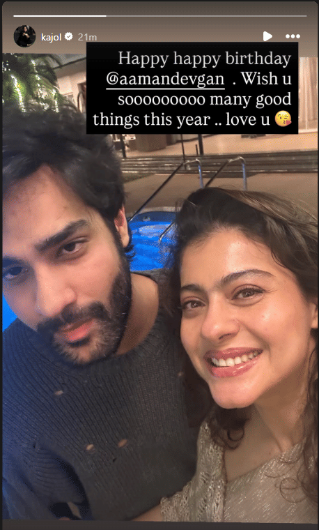 काजोल ने इंस्टाग्राम स्टोरी पर अमन के साथ अपनी एक प्यारी तस्वीर शेयर की है। इस तस्वीर के साथ काजोल ने लिखा, 'हैप्पी बर्थ डे अमन, इस साल तुम्हें बहुत सारी खुशियां मिलें।' आगे काजोल ने लिखा 'लव यू'।
