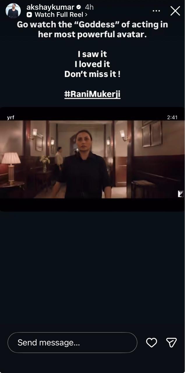 अक्षय कुमार ने रानी मुखर्जी की ‘मर्दानी 3’ के लिए इंस्टाग्राम स्टोरी पर एक पोस्ट साझा की है। इसमें उन्होंने फिल्म और रानी के अभिनय की जमकर तारीफ की है। अक्षय ने अपनी स्टोरी में लिखा, ‘अभिनय की देवी को उनके सबसे दमदार अवतार में देखने जाइए। मैंने फिल्म देखी, मुझे बहुत पसंद आई। इसे देखना न भूलें।’