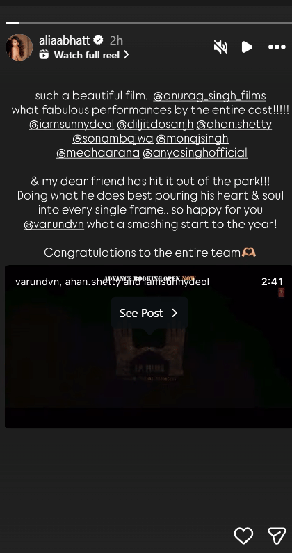 आलिया भट्ट ने आज अपनी इंस्टाग्राम स्टोरी पर फिल्म 'बॉर्डर 2' की तारीफ की है।उन्होंने फिल्म का एक सीन शेयर किया और लिखा कि यह कितनी खूबसूरत फिल्म है। उन्होंने डायरेक्टर अनुराग सिंह और पूरी टीम के शानदार काम की भी प्रशंसा की। आलिया ने खास तौर पर अपने दोस्त वरुण धवन की बहुत तारीफ की। आलिया ने लिखा कि वरुण ने हर फ्रेम में अपना दिल और जान लगा दी है। उन्होंने लिखा, 'मेरे प्यारे दोस्त ने कमाल कर दिया, साल की बहुत शानदार शुरुआत। पूरी टीम को बधाई।'