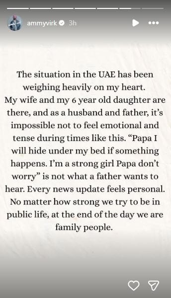 एमी विर्क ने बताया कि उनकी पत्नी और उनकी 6 साल की बेटी इस समय संयुक्त अरब अमीरात (UAE) में फंसी हुई हैं। वेस्ट एशिया क्षेत्र में बढ़ते तनाव के बीच अपने परिवार से दूर होना उनके लिए बहुत मुश्किल हो रहा है।