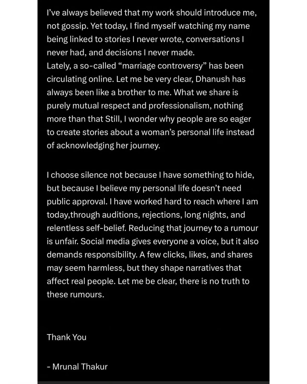 सोशल मीडिया पर मृणाल ठाकुर का एक लंबा-चौड़ा स्टेटमेंट वायरल हो रहा है। इसको अभिनेत्री के फैन पेज पर शेयर किया गया, इसके बाद ये वायरल है। इस स्टेटमेंट में मृणाल ठाकुर के हवाले से कहा गया है, ‘मैंने हमेशा यही माना है कि मेरा काम मेरी पहचान बने, न कि गपशप। फिर भी आज मैं खुद को ऐसी कहानियों से जुड़ा हुआ पाती हूं जो मैंने कभी नहीं लिखीं, ऐसी बातचीत जो मैंने कभी नहीं कीं और ऐसे फैसले जो मैंने कभी नहीं लिए।