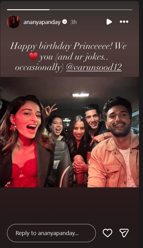इस तस्वीर में अनन्या आगे की सीट पर बैठी हैं। उन्होंने लाल रंग की सुंदर ड्रेस के ऊपर काली जैकेट पहनी हुई है। वरुण सूद पीछे की सीट पर बैठे हैं और फोटो क्लिक करवा रहे हैं। सीरीज के बाकी कलाकार भी कार में ही बैठे हैं और कैमरे के लिए पोज दे रहे हैं। अनन्या ने वरुण सूद को जन्मदिन की बधाई देते हुए लिखा, 'हैप्पी बर्थडे प्रिंस, हम आपसे प्यार करते हैं और कभी-कभी आपके चुटकुलों से भी।'