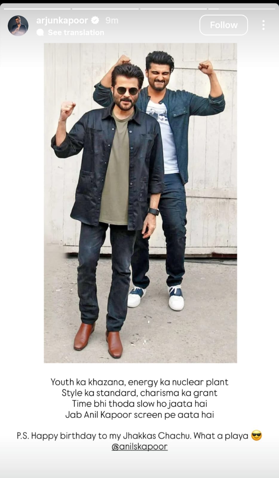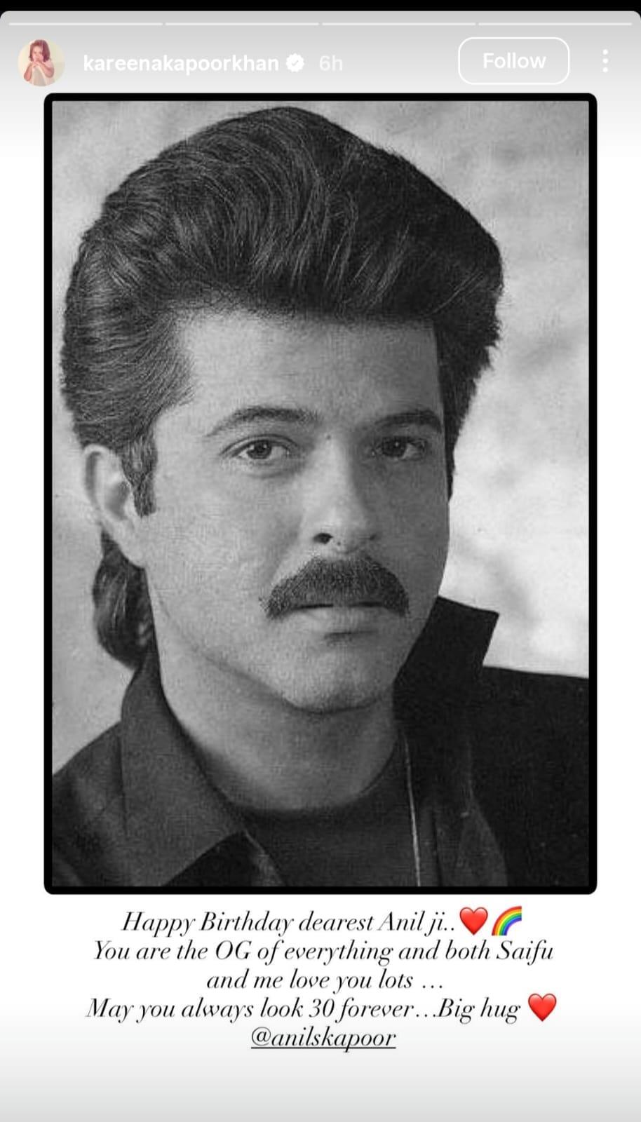 अर्जुन कपूर ने अपने चाचा यानी अनिल कपूर के एनर्जेटिक होने की जमकर तारीफ की है, उन्हें बर्थ डे विश किया। इसी तरह करीना कपूर ने भी अनिल कपूर के लिए लिखा कि वह हर काम में ग्रेट हैं। वह लिखती हैं कि अनिल, उनके और सैफ अली खान के पसंदीदा शख्स हैं।