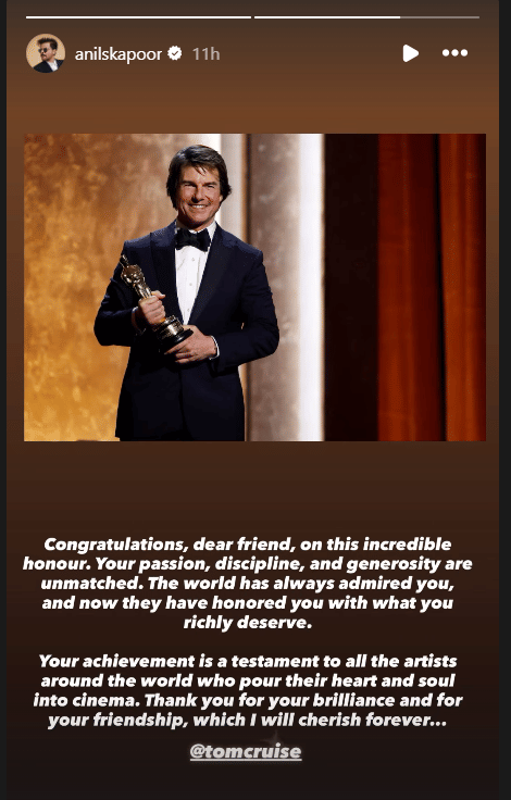 टॉम क्रूज को 16 नवंबर को हॉलीवुड के गवर्नर्स अवार्ड्स में मानद ऑस्कर (ऑनरेरी ऑस्कर) मिला है। अनिल, टॉम के लिए बेहद खुश हैं। अनिल ने इंस्टाग्राम स्टोरी पर टॉप की मानद ऑस्कर लेते एक खास तस्वीर शेयर कीं। इसके साथ अनिल ने लिखा, 'मेरे प्यारे दोस्त, इस शानदार सम्मान के लिए ढेर सारी बधाई। तुम्हारा जुनून, मेहनत और दिल की अच्छाई किसी से कम नहीं। दुनिया हमेशा से तुम्हें पसंद करती आई है और अब आधिकारिक तौर पर तुम्हें वो सम्मान मिल गया, जिसके तुम हकदार हो। तुम्हारी दोस्ती और प्रतिभा के लिए शुक्रिया।'