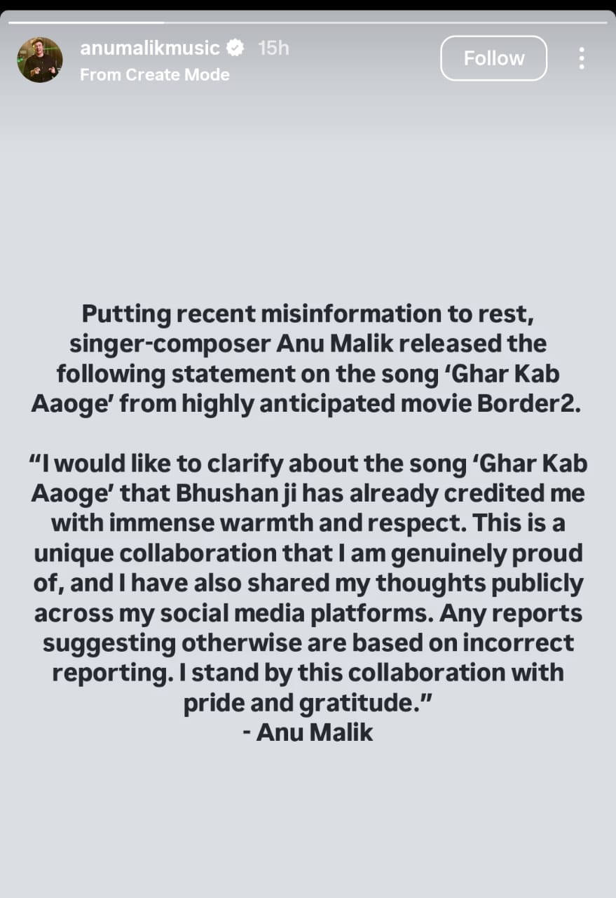 Song Ghar Kab Aaoge Credit Controversy: हाल ही में फिल्म ‘बॉर्डर 2’ का गाना ‘घर कब आओगे’ रिलीज हुआ। हाल ही में इस गाने को लेकर क्रेडिट विवाद खड़ा होता नजर आया। इस विवाद में अनु मलिक का नाम शामिल हुआ। अब एक सोशल मीडिया पोस्ट के जरिए अनु मलिक ने अपना पक्ष रखा है।