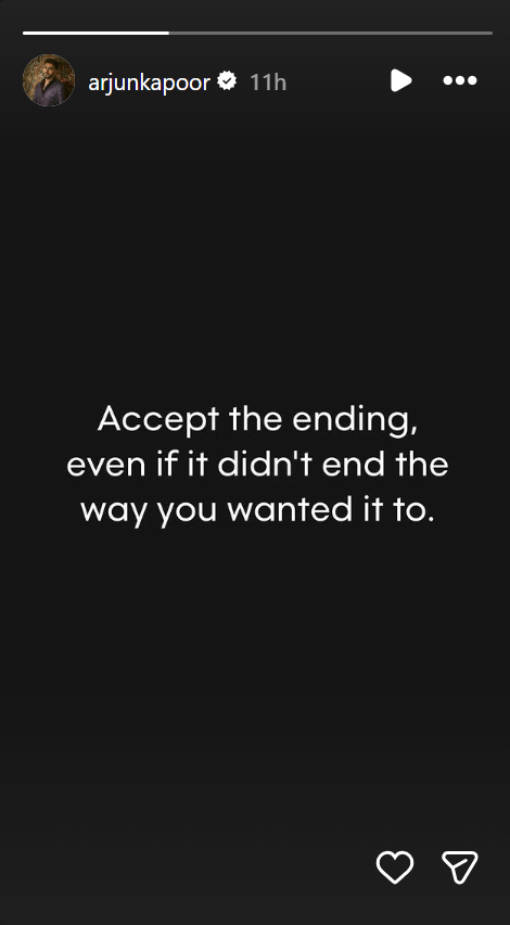 अर्जुन कपूर ने अपने इंस्टाग्राम की स्टोरीज में संदेश लिखा। इसमें उन्होंने लिखा, ‘अंत को स्वीकार करो, भले ही वह तुम्हारी इच्छा के अनुसार खत्म न हुआ हो।’ अर्जुन की इस क्रिप्टिक पोस्ट के सामने आते ही उनके फैंस चिंतित हो गए। तो वहीं उनके इस संदेश के अर्थ को लेकर तरह-तरह की अटकलें लगाई जाने लगीं।