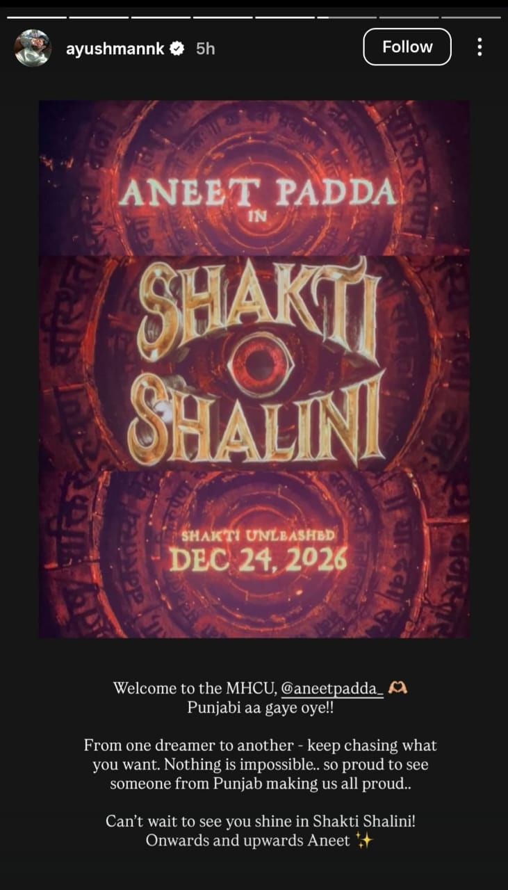 इन दिनों मैडाॅक की हॉरर-कॉमेडी फिल्म ‘थामा’ सिनेमाघरों में मौजूद है। इस बीच मैडॉक यूनिवर्स की अगली फिल्म ‘शक्ति शालिनी’ की घोषणा हुई। इसमें ‘सैयारा’ फेम अनीत नजर आएंगी। इस बात को लेकर आयुष्मान खुराना ने एक पोस्ट साझा की है। मैडॉक हॉरर-कॉमेडी यूनिवर्स में एंट्री पर अनीत का जबरदस्त स्वागत आयुष्मान खुरान ने किया है।