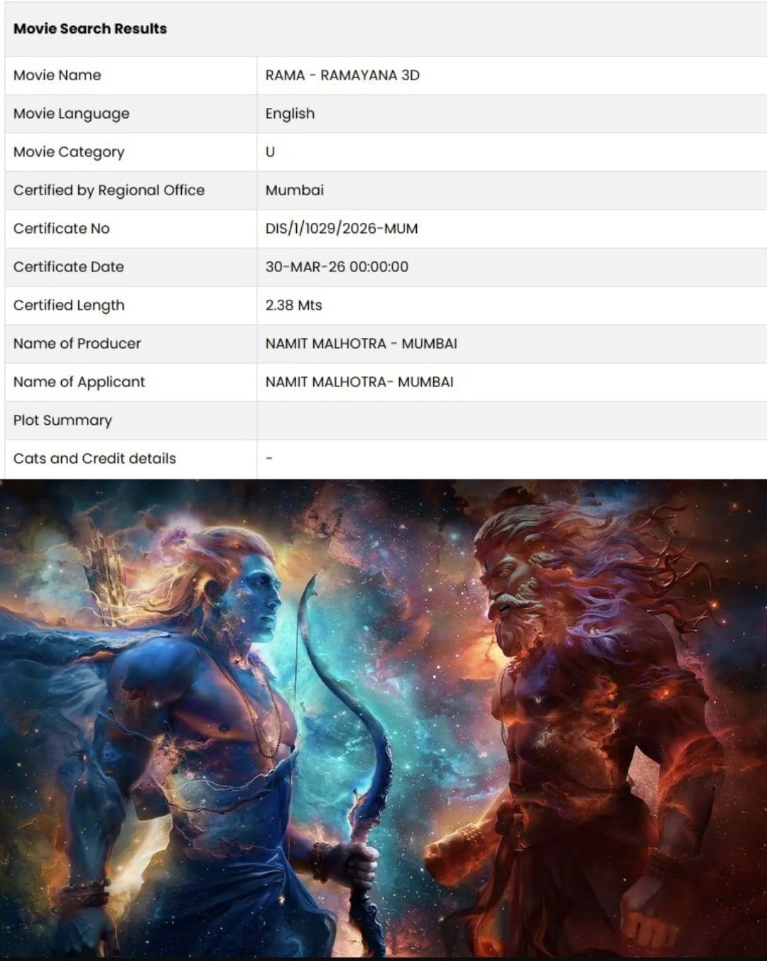 2 अप्रैल को दिखाए जाने वाली फिल्म की झलक को सेंसर बोर्ड से भी मंजूरी मिल गई है। मेकर्स का कहना है कि फिल्म से राम की झलक 2 अप्रैल को सामने आएगी। अब सीबीएफसी से मंजूरी मिलने वाले एक सर्टिफिकेट की तस्वीर सोशल मीडिया पर तेजी से वायरल हो रही है। इसमें दिख रहा है कि 'राम' शीर्षक वाली पहली झलक को 2 मिनट 38 सेकंड की अवधि के साथ प्रमाणित किया गया है। इसे यू कैटेगरी के साथ पास किया गया है।