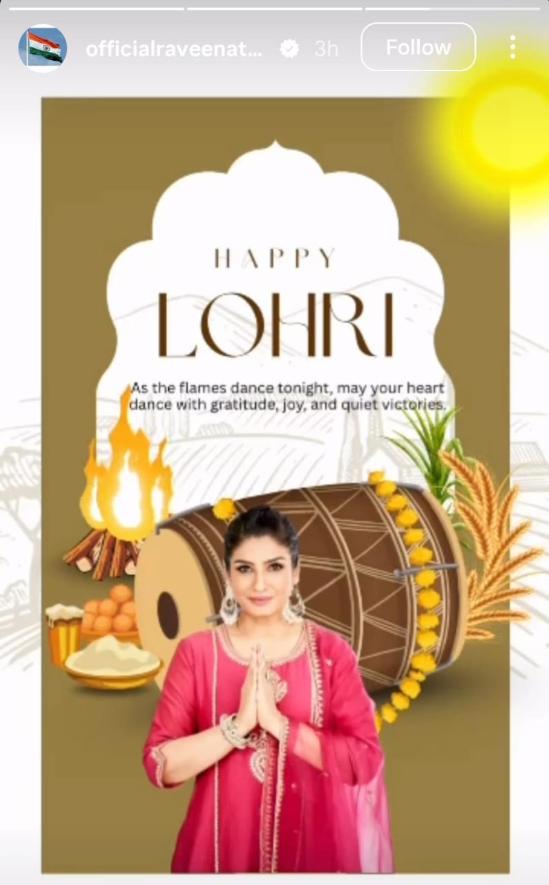 रवीना टंडन ने इंस्टाग्राम स्टोरी पर अपनी एक तस्वीर शेयर की, जिसमें वह पिंक सूट में हाथ जोड़े लोहड़ी की शुभकामनाएं देती नजर आ रही हैं। इस पोस्ट के साथ रवीना ने लिखा, 'जैसे आज रात आग की लपटें नाचेंगी, वैसे ही आपका दिल भी खुशी और शांत जीत के साथ नाचे।'