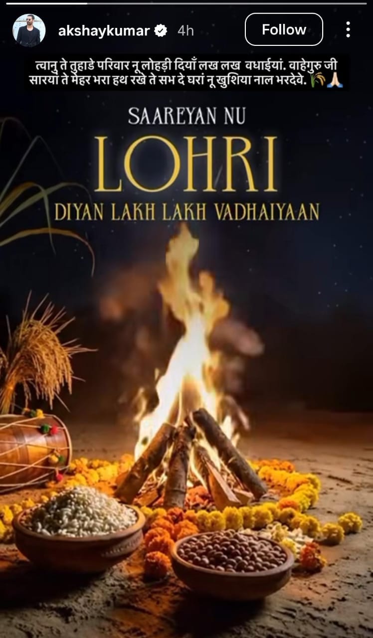 अक्षय कुमार ने इंस्टाग्राम स्टोरी शेयर पर अपने फैंस को लोहड़ी की हार्दिक शुभकामनाएं दी हैं। अक्षय ने पंजाबी में फैंस के लिए लिखा, 'आपको और आपके पूरे परिवार को लोहड़ी की लख-लख बधाई। वाहेगुरु जी आप सभी पर अपनी कृपा बनाए रखें और सभी के घरों को खुशियों से भर दें।'
