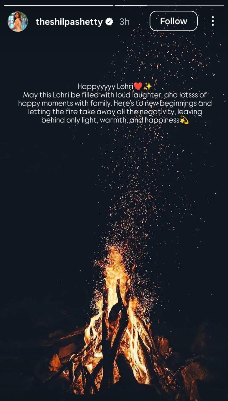 शिल्पा शेट्टी ने इंस्टाग्राम स्टोरी पर एक तस्वीर शेयर की और लिखा, 'हैप्पी लोहड़ी, आपकी यह लोहड़ी जोरदार हंसी और परिवार के साथ ढेर सारी खुशी के पलों से भरी हो। यह एक नई शुरुआत है और आग सारी नेगेटिविटी को दूर ले जाए, सिर्फ रोशनी, गर्माहट और खुशी बाकी रहे।'