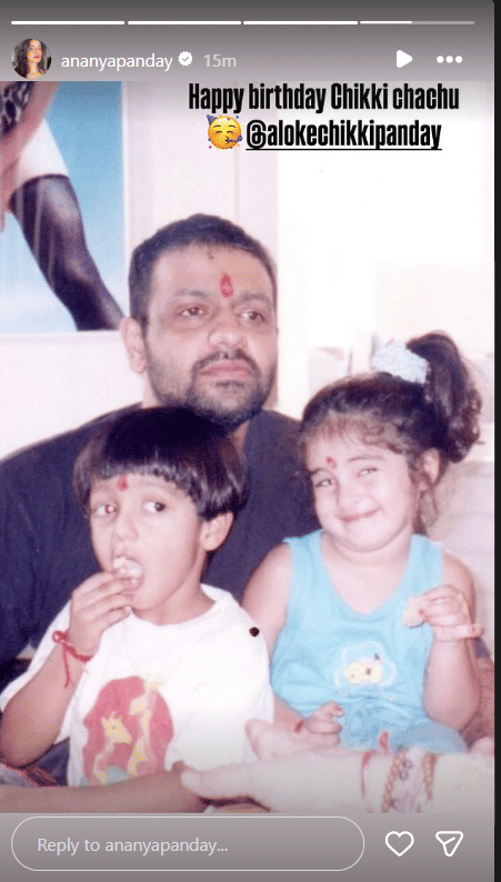 अनन्या पांडे ने अपने चाचू चिक्की पांडे को जन्मदिन की बधाई देते हुए इंस्टाग्राम स्टोरी पर एक प्यारी तस्वीर शेयर की है। यह अनन्या के बचपन की तस्वीर है, जिसमें वह अपने चाचू के साथ बेहद खुश नजर आ रही हैं। इस तस्वीर के साथ अनन्या ने लिखा, 'हैप्पी बर्थ डे चिक्की चाचू।'