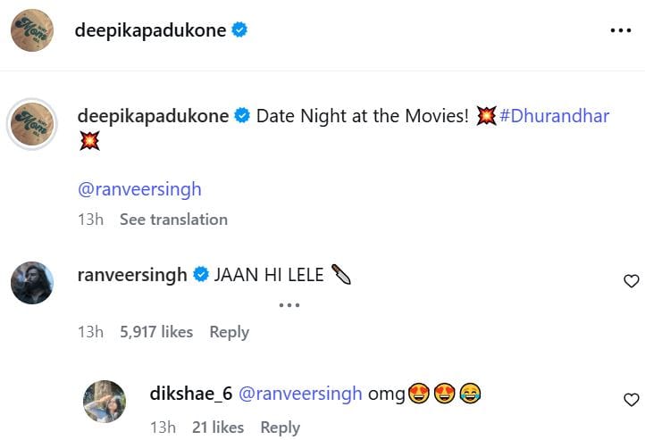 'जान ही ले ले'; दीपिका के पोस्ट पर रणवीर सिंह का मजेदार कमेंट; यूजर बोले- 'जान तो 'धुरंधर' में आपने ली है'
