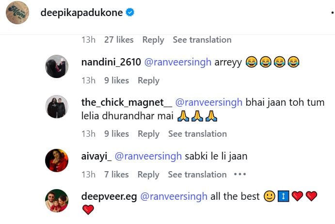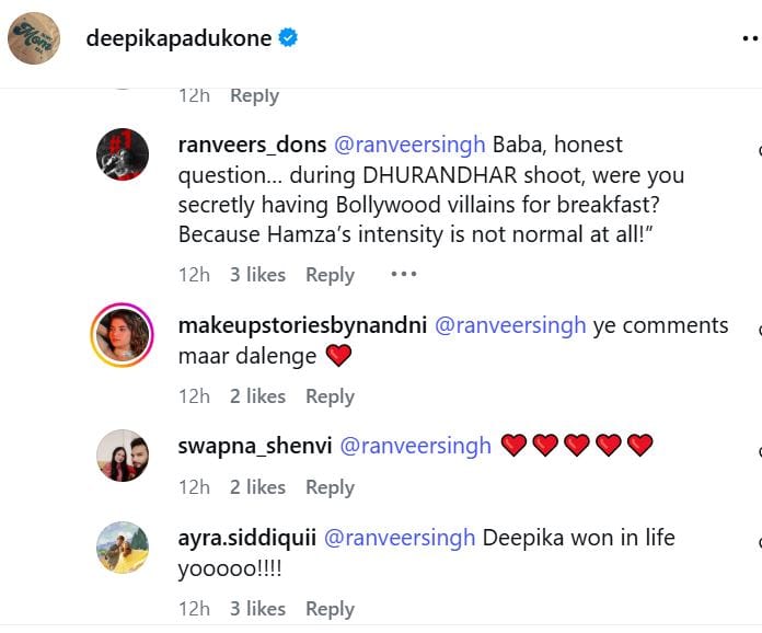 रणवीर सिंह के इस कमेंट ने नेटिजन्स का ध्यान आकर्षित किया है। इस पर यूजर्स ने मजेदार रिप्लाई दिए हैं। अधिकांश यूजर्स ने 'धुरंधर' में रणवीर की परफॉर्मेंस के लिए पीठ थपथपाई है। एक यूजर ने लिखा, 'भाई जान तो आपने ले ली है हम सबकी 'धुरंधर' में धांसू परफॉर्मेंस से'। एक अन्य यूजर ने लिखा, 'भाई आपने सबकी जान ले ली'। एक यूजर ने लिखा, 'ऑल द बेस्ट'। एक यूजर ने लिखा, 'आप बहुत लकी हो, जो दीपिका मिली हैं'।