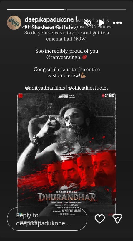 आदित्य धर के निर्देशन में बनी फिल्म 'धुरंधर' में रणवीर सिंह के अलावा संजय दत्त, आर माधवन, अक्षय खन्ना और अर्जुन रामपाल जैसे सितारे हैं। यह फिल्म सच्ची घटना से प्रेरित है। इसमें जबर्दस्त एक्शन और खून-खराबा है। हालांकि, दर्शकों से फिल्म का सकारात्मक प्रतिक्रिया मिली है। इस फिल्म ने ओपनिंग डे पर 27 करोड़ रुपये का कलेक्शन किया है। दीपिका पादुकोण ने फिल्म देखने के बाद अपनी प्रतिक्रिया दी है। उन्होंने रणवीर की तारीफ करते हुए लिखा है, 'तुम पर गर्व है'। साथ ही पूरी टीम को बधाई दी है।