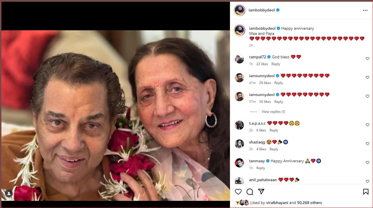 बॉबी देओल ने अपने इंस्टाग्राम पर पिता धर्मेंद्र और अपनी मां प्रकाश कौर की एक खास तस्वीर शेयर की और साथ ही कैप्शन में लिखा, 'हैप्पी एनिवर्सरी मां और पापा।' इसके साथ ही बॉबी ने कई लाल दिल वाले इमोजी बनाए हैं। बॉबी की इस पोस्ट पर अर्जुन रामपाल ने लिखा, 'भगवान भला करे।' वहीं सनी देओल ने बॉबी की इस पोस्ट पर दो बार कई सारे लाल दिल वाले इमोजी शेयर किए हैं। एक्टर तन्मय रंजन ने लिखा, 'हैप्पी एनिवर्सरी।'