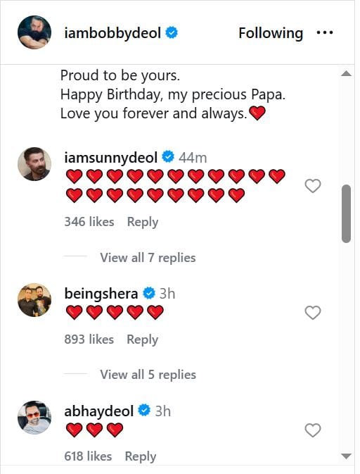 पिता धर्मेंद्र के लिए बॉबी देओल के इस पोस्ट पर तमाम सेलेब्स ने रिएक्शन दिया है। बॉबी देओल के बड़े भैया सनी देओल ने हार्ट इमोजी बनाए हैं। वहीं, अभय देओल ने भी रिएक्शन दिया है। इसके अलावा हुमा कुरैशी, फराह खान, मोना सिंह सहित कई अन्य सेलेब्स ने प्रतिक्रिया दी है। युवराज सिंह ने लिखा है, 'धरम जी आप हमेशा हमारे दिलों में रहेंगे'।
