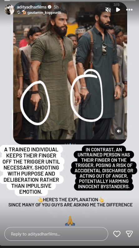 आदित्य धर ने इस पोस्ट के साथ लिखा, हमजा जरूरत पड़ने तक ट्रिगर से उंगली दूर रखता है और सोच-समझकर गोली चलाता है। लेकिन उजैर की उंगली ट्रिगर पर रहती है, जिससे गुस्से या गलती से गोली चल सकती है और निर्दोष लोग घायल हो सकते हैं। उन्होंने हमजा और उजैर की तस्वीर भी शेयर की ताकि अंतर समझ सकें।