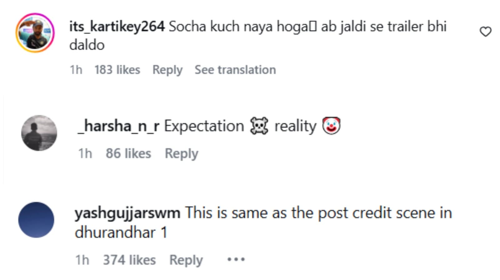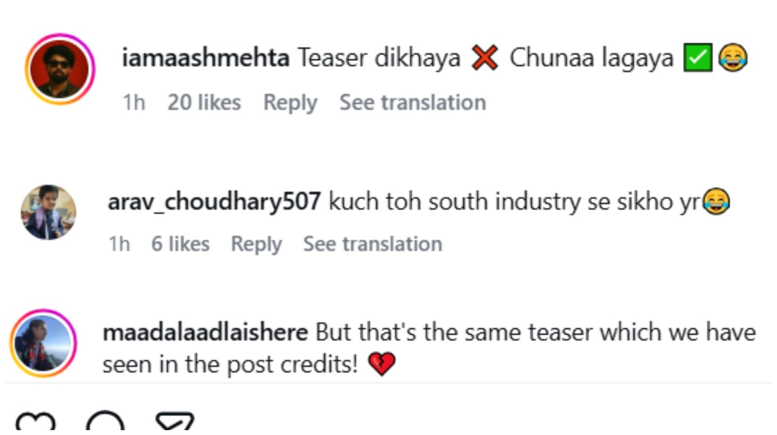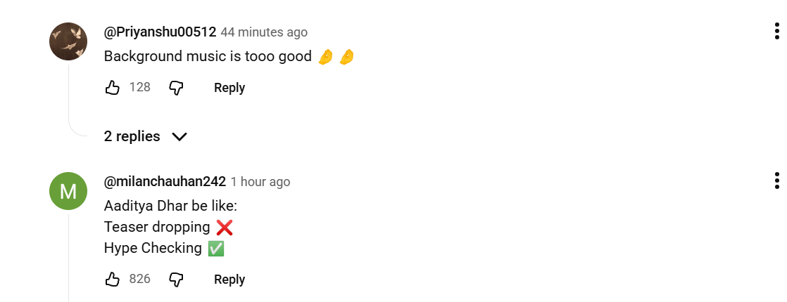 कुछ यूजर्स ‘धुरंधरः रिवेंज’ का टीजर देख इतना निराश हुए कि उन्होंने कमेंट किया कि मेकर्स ने टीजर न दिखाकर चूना लगा दिया। जबकि एक यूजर ने मेकर्स को साउथ के मेकर्स से सीखने की सलाह देते हुए कहा, ‘कुछ तो साउथ इंडस्ट्री से सीखो यार।’ कई ने कहा कि कुछ भी नया नहीं है। तो कुछ यूजर्स ने इसकी तुलना ‘धुरंधर’ के लास्ट क्रेडिट से कर दी।