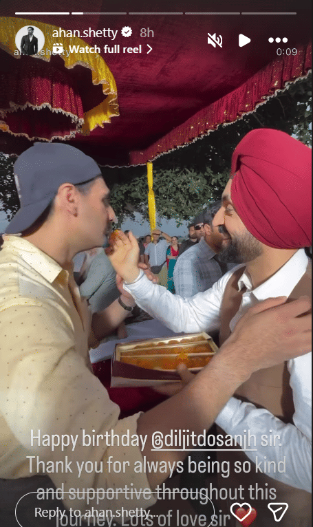 अहान ने इंस्टाग्राम स्टोरी पर दिलजीत के साथ एक खास वीडियो शेयर किया। इसमें दोनों एक दूसरे को गले लगाते नजर आ रहे हैं। अहान ने इस वीडियो के साथ लिखा, 'जन्मदिन मुबारक हो, दिलजीत सर। इस पूरे सफर में हमेशा इतना दयालु और सहयोगी रहने के लिए धन्यवाद।'