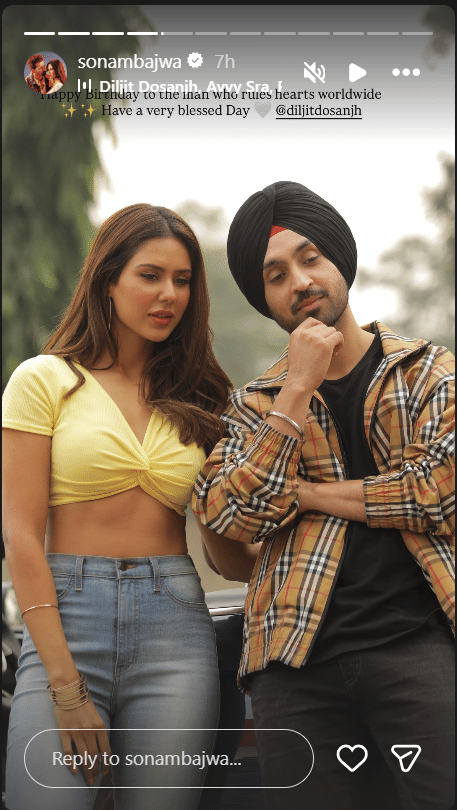 सोनम बाजवा ने भी दिलजीत को जन्मदिन पर बधाई दी। दोनों ने कई प्रोजेक्ट्स में साथ काम किया है। सोनम बाजवा ने अपने इंस्टाग्राम स्टोरी पर दिलजीत के साथ एक तस्वीर शेयर की। तस्वीर शेयर करते हुए सोनम ने लिखा, 'दुनिया भर के दिलों पर राज करने वाले शख्स को जन्मदिन की हार्दिक शुभकामनाएं।' सोनम और दिलजीत ने तीन फिल्मों में साथ काम किया है, जिनमें 'सरदारजी 2', 'सुपर सिंह', और 'हौंसला रख' शामिल हैं। अब दोनों जल्द 'बॉर्डर 2' में भी साथ नजर आएंगे।