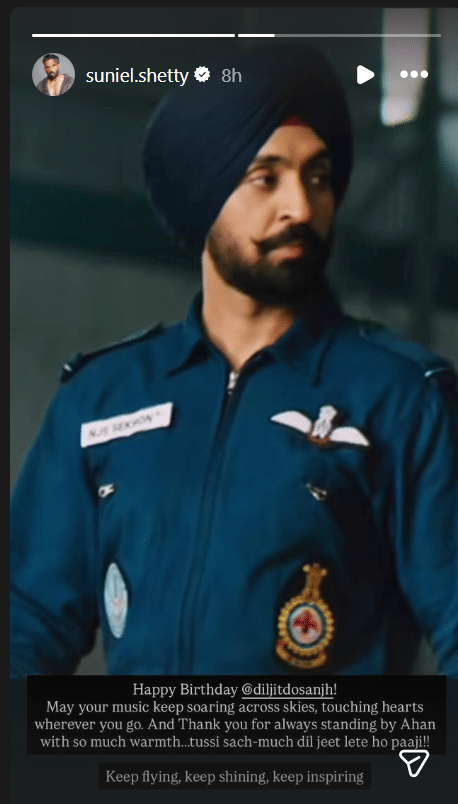 सुनील शेट्टी ने दिलजीत दोसांझ को उनके आगे के सफर के लिए शुभकामनाएं देते हुए लिखा, 'जन्मदिन मुबारक हो दिलजीत। आपका संगीत आसमान की ऊंचाइयों को छूता रहे और आप जहां भी जाएं, लोगों के दिलों को छूते रहें। अहान के साथ इतने प्यार से खड़े रहने के लिए धन्यवाद। आप सच में दिल जीत लेते हो पाजी।' आगे सुनील ने लिखा, 'उड़ते रहो, चमकते रहो, प्रेरणा देते रहो।'