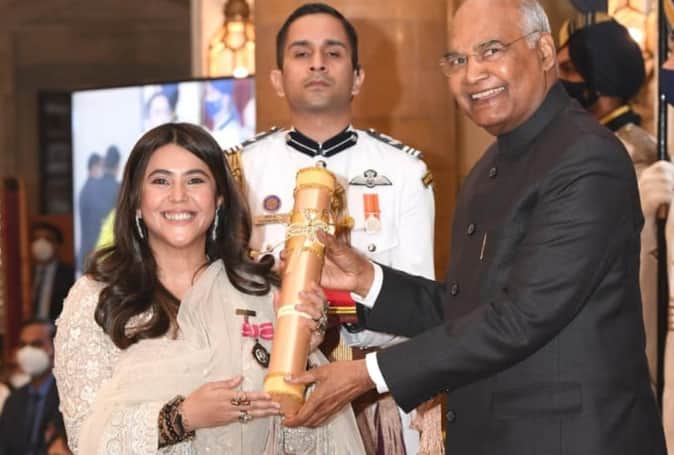 टीवी इंडस्ट्री की क्वीन और निर्माता एकता कपूर को आज यानी 8 नवंबर को चौथा सर्वोच्च नागरिक पुरस्कार ‘पद्मश्री पुरस्कार’ से सम्मानित किया गया। राष्ट्रपति रामनाथ कोविंद ने एकता कपूर को नई दिल्ली में राष्ट्रपति भवन में पुरस्कार दिया। एकता को फिल्म और डिजिटल प्लेटफॉर्म में अपने अहम योगदान के लिए सम्मानित किया गया। इस दौरान एकता कपूर के साथ उनके पिता जितेंद्र मौजूद थे। एकता कपूर ने पद्मश्री मिलने के बाद एक साथ कई ट्वीट किए। इस दौरान उन्होंने सभी को धन्यवाद दिया और अपने पुरस्कार को अपनी मां शोभा और पिता जितेंद्र को समर्पित किया।