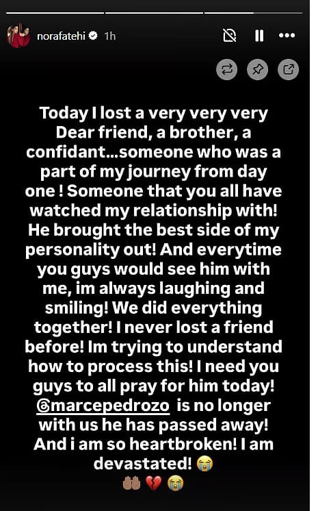 नोरा ने आगे लिखा, ‘मैंने पहले कभी किसी दोस्त को नहीं खोया। समझ नहीं आ रहा कि इसे कैसे स्वीकार करूं। आप सभी से निवेदन है कि आज उनके लिए दुआ करें। अब मार्से पेड्रोजो हमारे बीच नहीं रहे। उनका निधन हो गया है और मेरा दिल टूट गया है। मैं पूरी तरह से टूट चुकी हूं।’