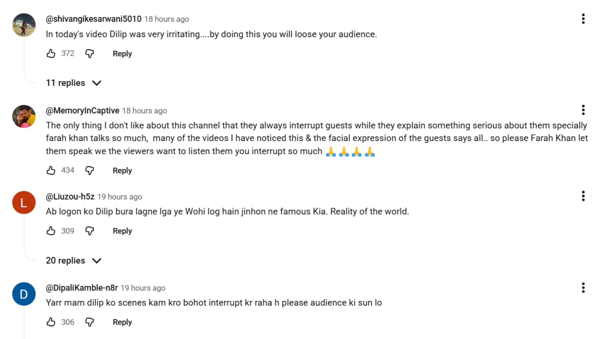 - एक अन्य यूजर ने कमेंट किया, ‘इस चैनल के बारे में मुझे सिर्फ एक बात पसंद नहीं है कि वे हमेशा मेहमानों को बीच में टोकते हैं। जब वे अपने बारे में कुछ गंभीर बात बताते हैं, खासकर फराह खान बहुत ज्यादा बोलती हैं। मैंने कई वीडियो में यह देखा है और मेहमानों के चेहरे के हाव-भाव सब कुछ कह देते हैं। प्लीज फराह खान उन्हें बोलने दो। हम दर्शक उन्हें सुनना चाहते हैं, आप बहुत ज्यादा टोकती हैं।’