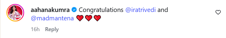 मधु मंटेना और इरा त्रिवेदी ने एक साझा पोस्ट अपने-अपने इंस्टाग्राम पर शेयर की है। कपल ने नीले रंग के पदचिह्न और भगवान कृष्ण की तस्वीर वाली एक पोस्ट साझा की। इसके साथ ही एक दिल छू लेने वाले कैप्शन में इस आशीर्वाद के लिए भगवान का आभार व्यक्त किया।