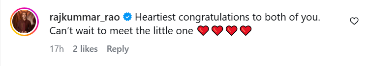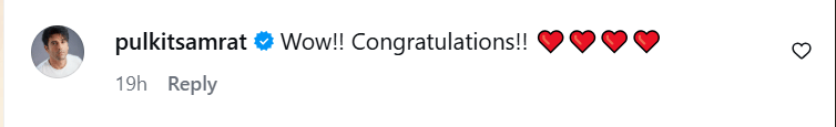 कपल के इस गुड न्यूज को साझा करते ही उन्हें बधाइयां देने का सिलसिला भी शुरू हो गया। फैंस समेत कई सेलेब्स ने भी कपल को बधाई दी। इसमें राजकुमार राव, रवीना टंडन और पुलकित सम्राट सहित कई हस्तियों ने कपल को शुभकामनाएं दीं और नवजात बच्चे के लिए अपना प्यार भेजा।