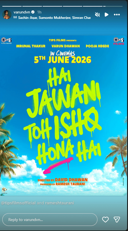 वरुण धवन ने आज इंस्टाग्राम स्टोरी पर अपनी आगामी रोमांटिक कॉमेडी फिल्म 'है जवानी तो इश्क होना है' की एक तस्वीर शेयर की। जिसमें नारियल के पेड़ों के साथ बीच में लिखा फिल्म का नाम 'है जवानी तो इश्क होना है'। इसके साथ ही सबसे ऊपर वरुण धवन, मृणाल ठाकुर और पूजा हेगड़ा का नाम लिखा दिखाई दिया। इसी के साथ फिल्म की रिलीज डेट 5 जून 2026 लिखी है।