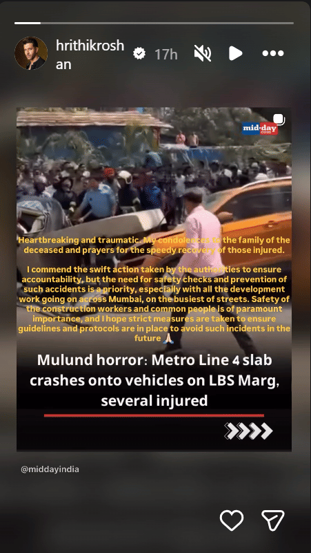 ‘मजदूरों और लोगों की सुरक्षा सबसे जरूरी’, मुंबई मेट्रो पिलर हादसे पर ऋतिक रोशन ने जताया दुख; की ये बड़ी मांग