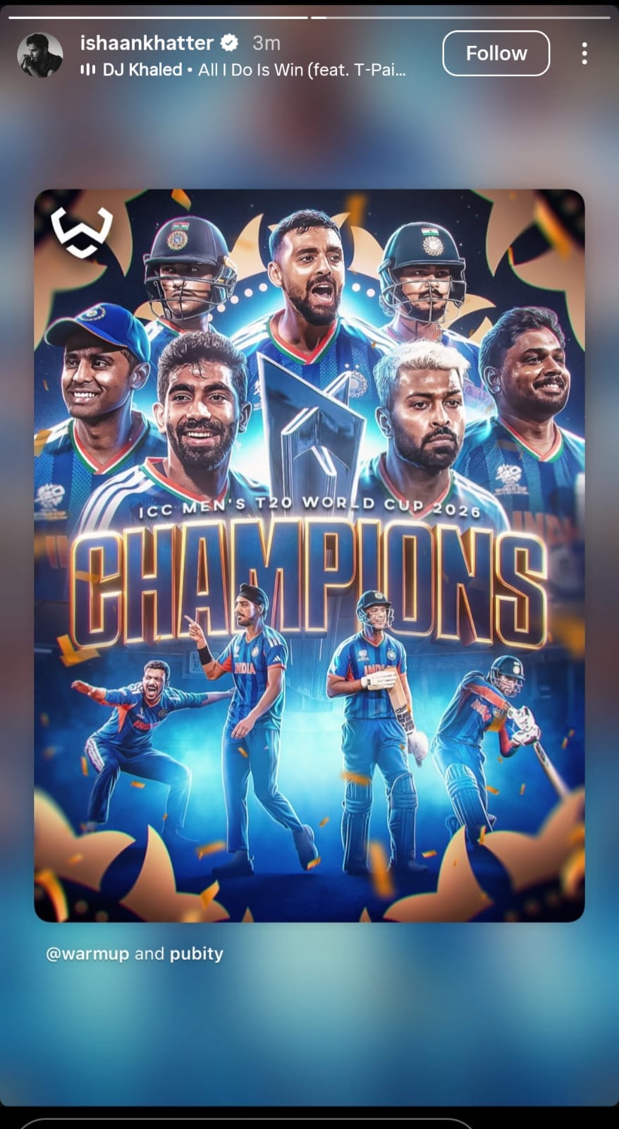 ईशान खट्टर किसी शूट के दौरान मैच देख रहे थे। जैसे ही टीम इंडिया जीती, उन्होंने इंस्टाग्राम पर पोस्ट साझा करते हुए चैंपियंस को बधाई दी।