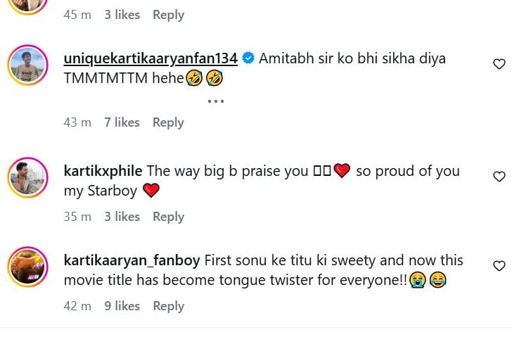 समीर विद्वांस के निर्देशन में बनी कार्तिक और अनन्या की यह फिल्म 25 दिसंबर को सिनेमाघरों में दस्तक देगी। आज साझा किए गए पोस्ट के साथ कार्तिक आर्यन ने काफी मजेदार कैप्शन लिखा है। उन्होंने लिखा है, 'कह दिया ना! बस!! कह दिया 25 दिसंबर।' इस पोस्ट पर नेटिजन्स के मजेदार रिएक्शन आ रहे हैं। एक यूजर ने लिखा, 'अमिताभ बच्चन सोच रहे होंगे, इतना बड़ा टाइटल क्यों रखा फिल्म का'। एक यूजर ने लिखा, 'अमिताभ बच्चन को भी सिखा दिया'। एक यूजर ने लिखा है, 'इस फिल्म का टाइटल मजेदार टंग ट्विस्टर बन गया है'।