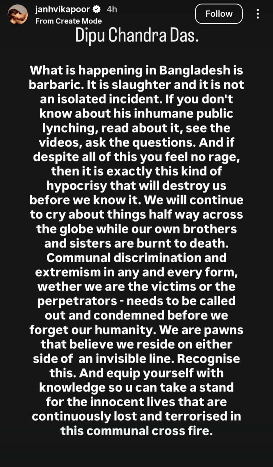 जान्हवी कपूर अपनी पोस्ट में सबसे पहले दीपू चंद्र दास का नाम लिखती हैं। फिर वह लिखती हैं, ‘बांग्लादेश में जो हो रहा है, वह बर्बर है। यह नरसंहार है। यह कोई अकेली घटना नहीं है। अगर आपको इस पब्लिक लिंचिंग के बारे में नहीं पता है, तो इसके बारे में पढ़ें, वीडियो देखें, सवाल पूछें। अगर इन सबके बावजूद आपको गुस्सा नहीं आता, तो यही पाखंड हमें तबाह कर देगा।’
