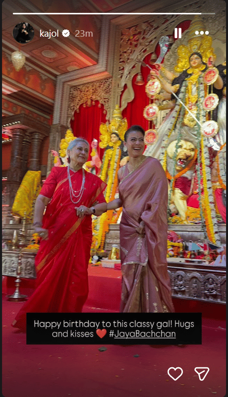 काजोल ने आज जया बच्चन के जन्मदिन पर एक खास तस्वीर अपनी इंस्टाग्राम स्टोरी पर शेयर की है। यह तस्वीर दुर्गा पंडाल के दौरान की लग रही है। इस तस्वीर में दोनों हंसते हुए बेहद खुश लग रही हैं। इस तस्वीर के साथ काजोल ने लिखा, 'हैप्पी बर्थडे क्लासी गर्ल।' इसके साथ ही काजोल ने लाल दिल वाला इमोजी बनाया है।