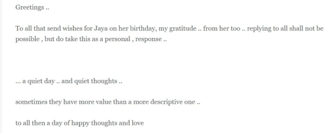 अमिताभ बच्चन ने उन सभी लोगों का शुक्रिया अदा किया है जिन्होंने जया बच्चन को जन्मदिन की बधाई दी है। उन्होंने अपने ब्लॉग में लिखा, 'जया को उनके जन्मदिन पर शुभकामनाएं देने वाले सभी लोगों को उनकी तरफ से भी धन्यवाद। सभी को जवाब देना मुमकिन नहीं होगा, लेकिन इसे एक पर्सनल जवाब समझें।' बिग बी ने आगे लिखा, 'कभी-कभी, एक ज्यादा विस्तृत बात के मुकाबले, एक संक्षिप्त बात का महत्व कहीं अधिक होता है। तो चलिए, आज का दिन खुशियों भरे विचारों और प्रेम से भरा हो।'