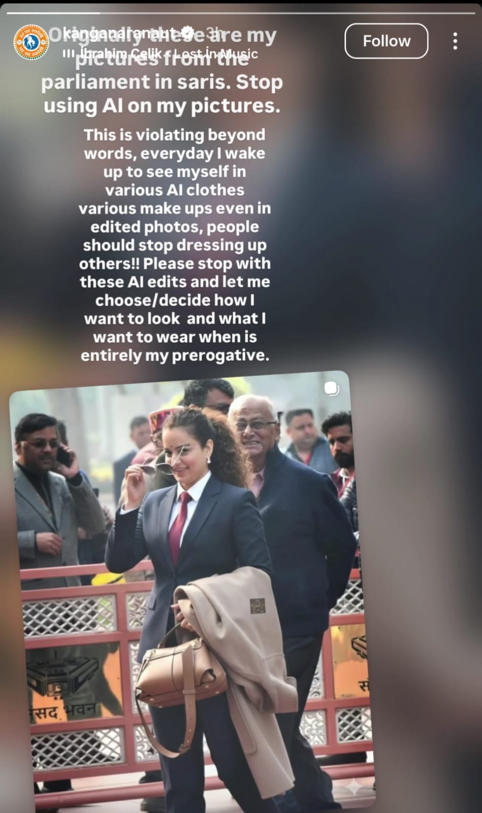 सोमवार को एक इंस्टाग्राम पोस्ट करते हुए कंगना लिखती हैं, ‘मेरी तस्वीरों पर AI का इस्तेमाल करना बंद करो। यह बहुत ज्यादा गलत बात है। हर दिन मैं उठकर खुद को अलग-अलग AI ड्रेसेस और अलग-अलग मेकअप में देखती हूं। यहां तक कि एडिटेड तस्वीरों में भी, लोगों को दूसरों को कपड़े पहनाना बंद कर देना चाहिए। प्लीज इन AI एडिट्स को बंद करें। मुझे यह चुनने/तय करने दें कि मैं कैसी दिखना चाहती हूं? क्या पहनना चाहती हूं? यह पूरी तरह से मेरा अधिकार है।’