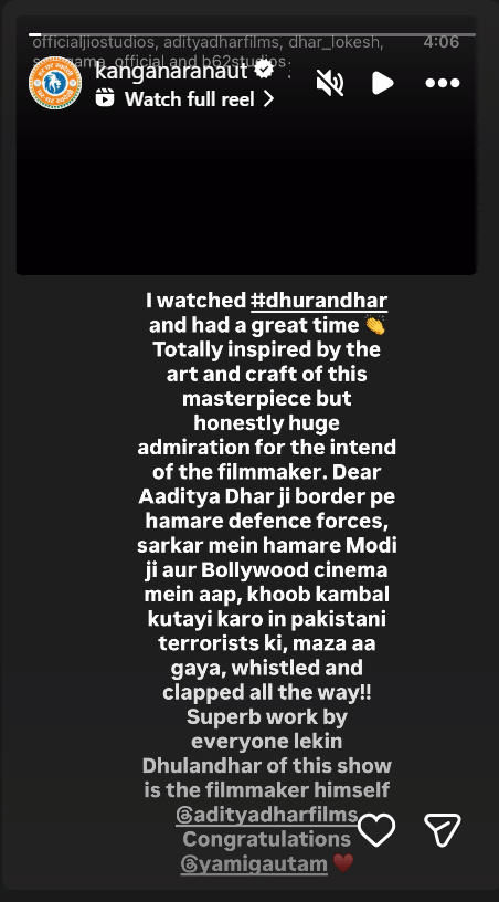 कंगना ने अपने इंस्टाग्राम पर ‘धुरंधर’ को लेकर एक स्टोरी साझा की है। अपनी स्टोरी में ‘धुरंधर’ की तारीफ करते हुए एक्ट्रेस ने लिखा, ‘मैंने धुरंधर देखी और मुझे बहुत अच्छी लगी। इस शानदार फिल्म के आर्ट और क्राफ्ट मैं पूरी तरह से प्रेरित हूं। लेकिन ईमानदारी से कहूं तो मेकर्स के इरादे के लिए मेरे मन में बहुत प्रशंसा है। आदित्य धर जी बॉर्डर पर हमारे रक्षा बल, सरकार में हमारे मोदी जी और बॉलीवुड सिनेमा में आप। पाकिस्तानी आतंकवादियों की खूब कम्बल कुटाई करो, मजा आ गया। पूरे वक्त सीटियां और तालियां बजती रहीं। सभी ने शानदार काम किया है, लेकिन इस शो के धुरंधर खुद आदित्य धर हैं। यामी गौतम आपको भी बधाई।’
