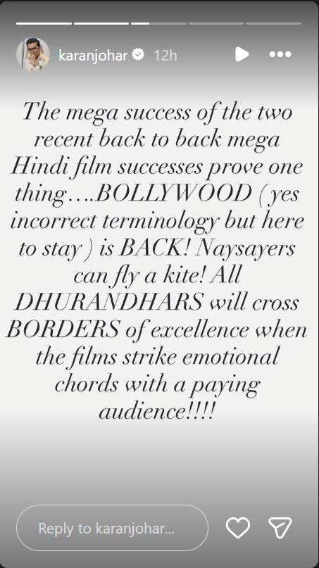 ‘धुरंधर’ और ‘बॉर्डर 2’ की सफलता से उत्साहित करण जौहर ने अपने इंस्टाग्राम पर एक स्टोरी साझा की। इसमें करण ने इन फिल्मों की सफलता से बॉलीवुड की मजबूत स्थिति की ओर से इशारा किया है। करण ने अपनी स्टोरी पर लिखा, ‘हाल ही में लगातार रिलीज हुईं दो बड़ी हिंदी फिल्मों की सफलता एक बात साबित करती है कि बॉलीवुड (हां, यह शब्द थोड़ा गलत है, लेकिन यह यहीं रहने वाला है) वापस आ गया है। आलोचकों की बातें बेकार हैं। जब ये फिल्में दर्शकों के दिलों को छू लेंगी, तो सभी 'धुरंधर' उत्कृष्टता की नई ऊंचाइयों को छू लेंगी।’ करण की यह प्रतिक्रिया 'बॉर्डर 2' की सफलता के बाद आई है, जिसने अपने ओपनिंग डे पर ‘धुरंधर’ को भी पीछे छोड़ दिया। फिल्म बॉक्स ऑफिस पर लगातार शानदार प्रदर्शन कर रही है।