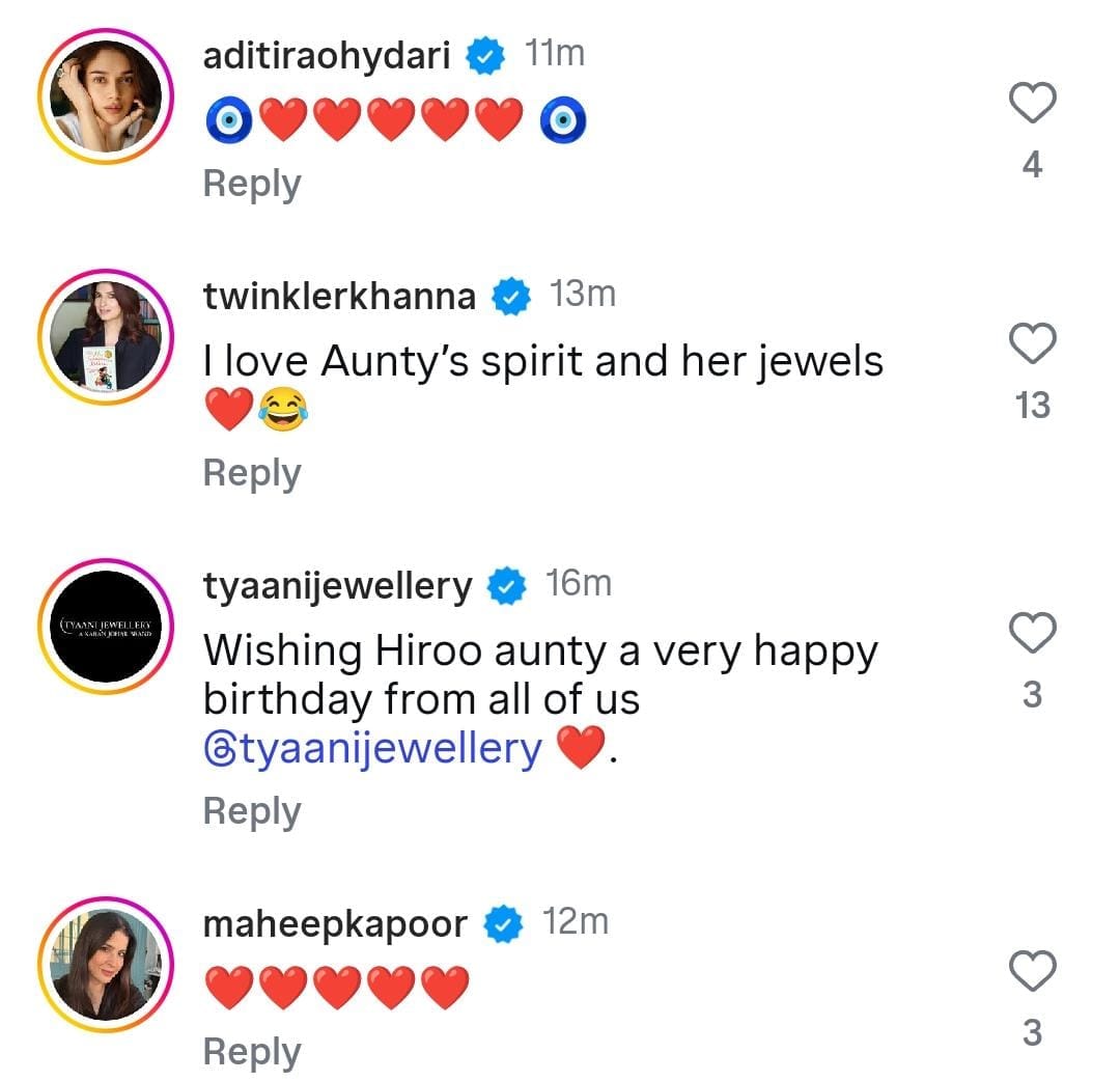 करण के पोस्ट करने के बाद सेलेब्स ने भी उनकी मां को विश किया। अभिनेत्री ट्विंकल खन्ना ने भी करण की पोस्ट पर कमेंट सेक्शन में लिखा, 'मैं आंटी के जीवन जीने के तरीकों को सलाम करती हूं। एक्ट्रेस अदिति राव हैदरी ने भी फिल्म मेकर की पोस्ट में हार्ट इमोजी भेजे हैं। वहीं महीप कपूर ने भी हार्ट का इमोजी को भेजा।