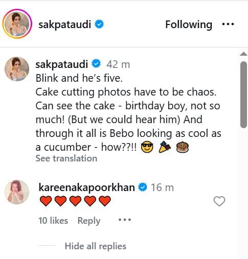 सोहा अली खान ने कैप्शन लिखा है, 'पलक झपकते ही पांच साल का हो गया। केक कटिंग की फोटोज में बहुत गड़बड़ होती है। केक दिख रहा है, लेकिन बर्थडे बॉय, उतना नहीं। हालांकि, हम उसे सुन सकते थे। इस सब के बीच बेबो एकदम कूल दिख रही है। आखिर कैसे'?