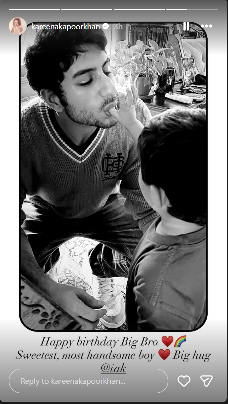 करीना कपूर खान ने इंस्टाग्राम स्टोरी पर तैमूर के साथ इब्राहिम की फोटो शेयर की, जिसमें तैमूर बड़े भाई को केक खिलाते बेहद खुश दिख रहे हैं। करीना ने कैप्शन में लिखा, 'जन्मदिन मुबारक हो, सबसे प्यारे और सबसे हैंडसम लड़के, ढेर सारा प्यार।'