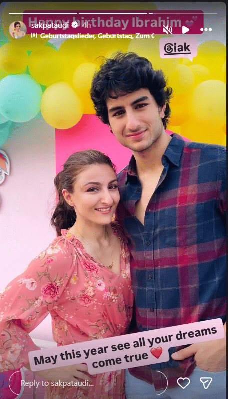 सबा के अलावा सोहा अली खान ने भी इब्राहिम के साथ एक फोटो इंस्टाग्राम स्टोरी पर शेयर की और साथ ही उन्हें जन्मदिन की बधाई दी है। सोहा ने लिखा, 'इस साल तुमहारी हर ख्वाहिश पूरी हो।'