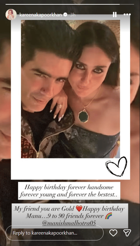 बॉलीवुड एक्ट्रेस करीना ने इंस्टाग्राम स्टोरी पर मनीष के साथ अपनी एक सेल्फी शेयर की और लिखा, 'जन्मदिन मुबारक हो… हमेशा हैंडसम, हमेशा जवान और हमेशा सबसे बेस्ट रहने के लिए। मेरे दोस्त, तुम सोने जैसे हो। मनु, जन्मदिन मुबारक… हम 9 से 90 तक हमेशा दोस्त रहेंगे।