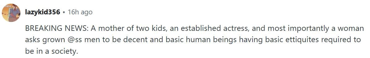 एक और यूजर ने टिप्पणी की, 'ब्रेकिंग न्यूज- दो बच्चों की मां, एक जानी-मानी अभिनेत्री और सबसे अहम बात- एक महिला, कुछ बड़े हो चुके पुरुषों से यह गुजारिश कर रही है कि वे थोड़ा ढंग से पेश आएं और तमीज में रहें।'