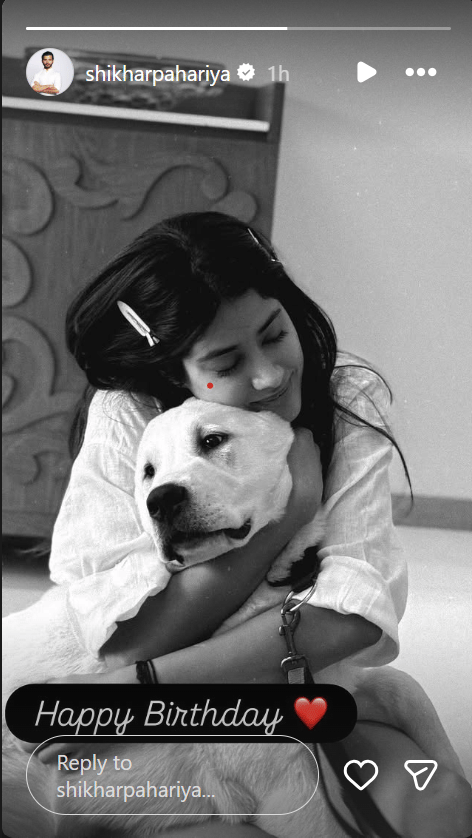 जान्हवी को कई बार अपने रूमर्ड बॉयफ्रेंड शिखर पहाड़िया के साथ स्पॉट किया गया है। जान्हवी को हर साल उनके बर्थ डे पर वो अलग अंदाज में विश करते आए हैं। इस बार भी उन्होंने एक्ट्रेस के लिए सोशल मीडिया पर पोस्ट कर उन्हें जन्मदिन की बधाईयां दी । साथ ही उनकी एक तस्वीर भी साझी की है। तस्वीर में जान्हवी अपने डॉग के साथ हैं। इस फोटो को शिखर ने ‘हैप्पी बर्थ डे’ लिखकर हार्ट इमोजी से सजाया है।
