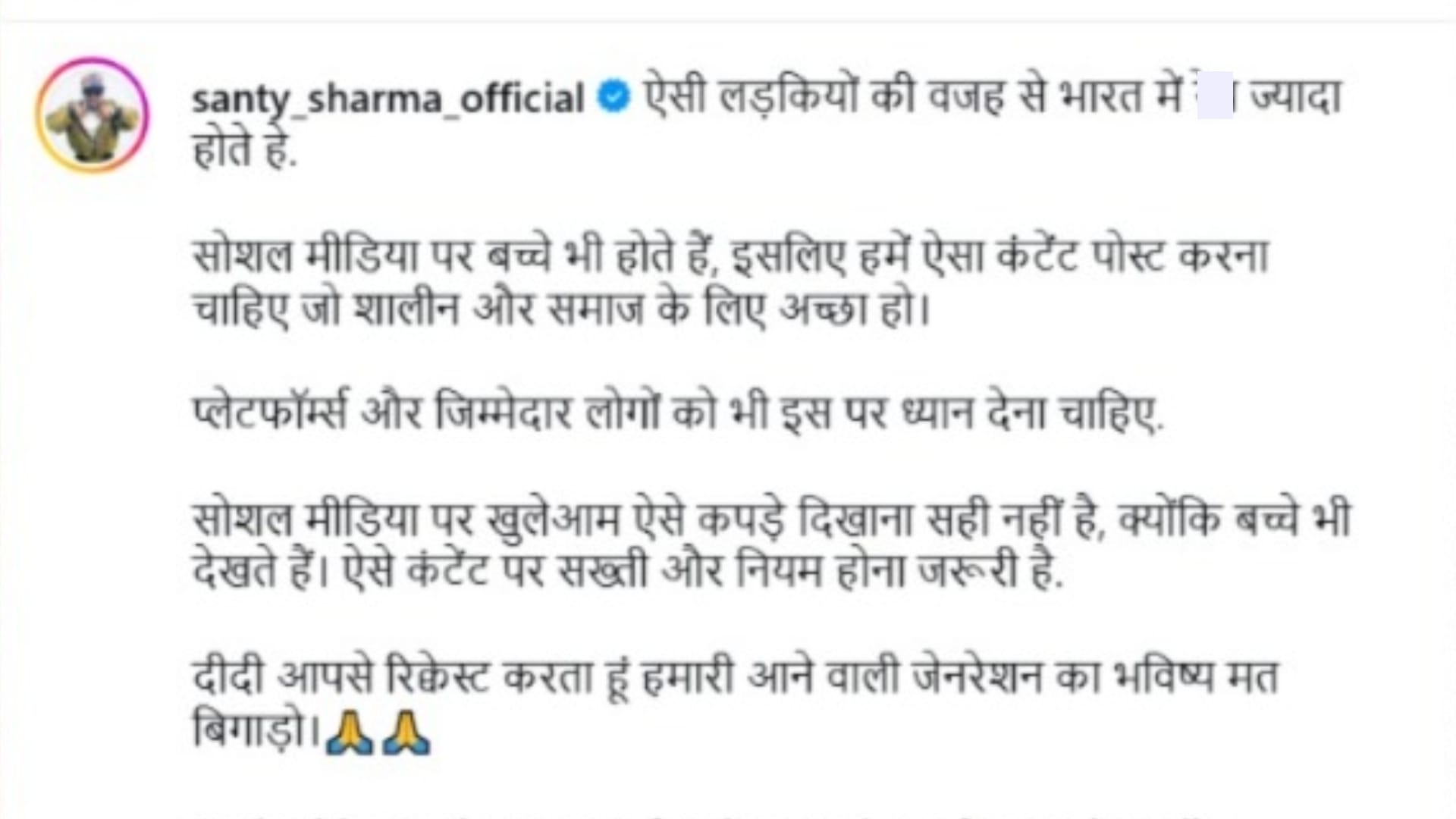 रैपर शेंटी ने गुरुवार को एक पोस्ट इंस्टाग्राम करते हुए लिखा, ‘सोशल मीडिया पर बच्चे भी होते हैं, इसलिए हमें ऐसा कंटेंट पोस्ट करना चाहिए जो शालीन और समाज के लिए अच्छा हो। प्लेटफॉर्म्स और जिम्मेदार लोगों को भी इस पर ध्यान देना चाहिए। सोशल मीडिया पर खुलेआम ऐसे कपड़े दिखाना सही नहीं है, क्योंकि बच्चे भी इसे देखते हैं। ऐसे कंटेंट पर सख्ती और नियम होना जरूरी है। दीदी (खुशी मुखर्जी) आपसे रिक्वेस्ट करता हूं हमारी आने वाली जेनरेशन का फ्यूचर मत बिगाड़ो।’ अपनी पोस्ट में शेंटी शर्मा ने यह भी लिखा कि ऐसी लड़कियों की वजह से भारत में दुष्कर्म ज्यादा होते हैं। रैपर की यह विवादित टिप्पणी अब चर्चा में आ गई है।