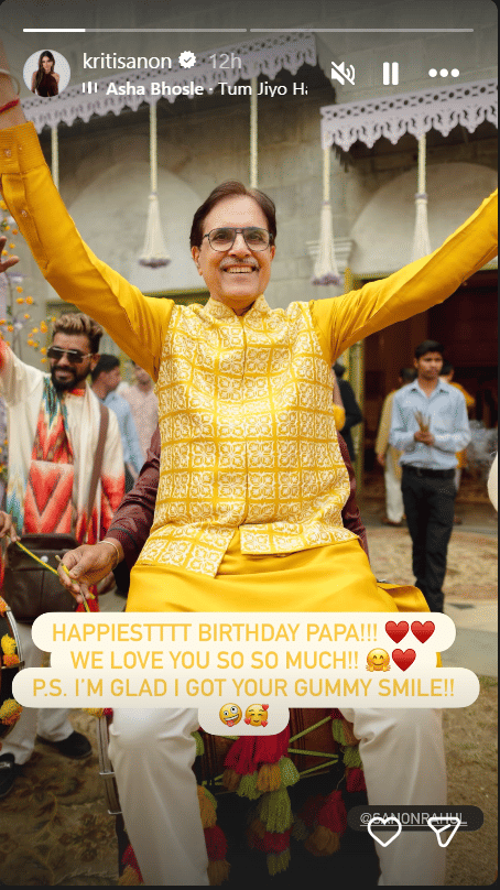 अभिनेत्री कृति सेनन ने अपने पिता राहुल के जन्मदिन पर इंस्टाग्राम पर एक प्यारी पोस्ट शेयर की है। उन्होंने अपने पिता की एक तस्वीर इंस्टाग्राम स्टोरी पर शेयर की और उनका शुक्रिया अदा करते हुए लिखा, 'जन्मदिन की बहुत-बहुत शुभकामनाएं पापा हम आपसे बहुत प्यार करते हैं। मुझे खुशी है कि मुझे आपकी प्यारी सी मुस्कान विरासत में मिली है।'